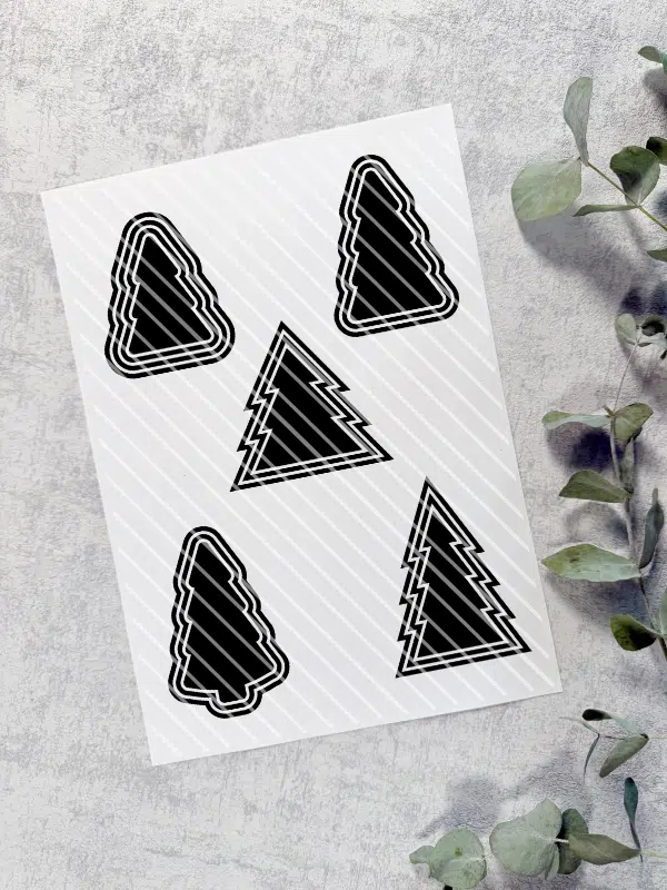 WICHTIG: Nach dem öffnen der Datei, gruppierst Du bitte alle Bäume und schaust, dass die Größe 1026,43mm und 307,55mm beträgt. Nachdem sie die richtige Größe haben kannst Du sie wieder entgruppieren und beide hälten eines Baumes passen perfekt auf ein A4 Bogen Pappe.